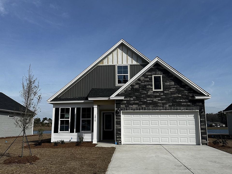 This Jasmine is a gorgeous three bedroom, three bathroom home with tons of upgrades on a stunning homesite. Upon entry, an extended foyer leads you to a guest bedroom at the front with a full bath and linen closet. At the center of the home, the living room has a fireplace creating a warm and cozy ambiance. The kitchen overlooks the eat-in area and includes a corner pantry with spacious island. White cabinets, gray tile backsplash and quartz countertops create a coastal modern feel. At the back of the home is a rear covered patio with an additional patio extension. Enjoy your morning coffee with a fabulous water view in your backyard, and colorful Carolina sunsets in the evening. The primary suite is also located on the first floor at the back of the home, showcasing the same amazing views. En-suite bath includes quartz countertops and five-foot tiled shower with glass enclosure. The walk-in closet is expansive and features a surprise laundry pass-through, connecting the walk-in closet to your laundry room...a fan-favorite! Upstairs is a guest suite with private bath and two closets. There is also a sizeable floored-storage area for all your seasonal needs. This home is complete with a laundry room located at garage entry with cabinets over the washer and dryer. Additional options include tray ceilings in the great room and primary bedroom and upgraded profile dual-fuel gas range in the kitchen. Estimated completion March 2024. Interior photos are of another home for representation only. Gutters and full irrigation system are included! Merrill Villas is in the heart of Carolina Forest offering convenient access to amazing shops, restaurants, championship golf courses, and Myrtle Beach International Airport, and is less than five miles to the beach!
