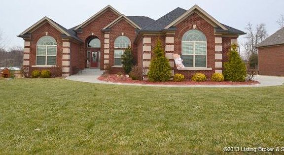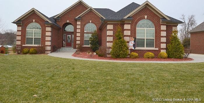 This is one of the nicest custom homes in the Sellersburg area. The home has gorgeous wainscoting in the custom dining room and the beautiful kitchen has a large wrap around granite countertop that opens into a dining nook in the rear of the home. Master bath has double vanities and separate closets . An elegant wide cutback stairway leads down to the lower level where another large bedroom, a full bath and a very cool custom bar sits in a recessed area. A 2nd custom stone fireplace is located here. A Trane dual HVAC system, hardwood, ceramic flooring, stainless appliances, security system and too many extras to mention abound in this gorgeous home. The great room has 12' ceilings and special 3-5 piece crown molding. The lower level also has a 16x14 garden garage, and an extra room that could be converted to a 5th bedroom easily. Outside covered decks are also on both floors at the rear of the home. Come to Caiman Court - you won't want to leave!
