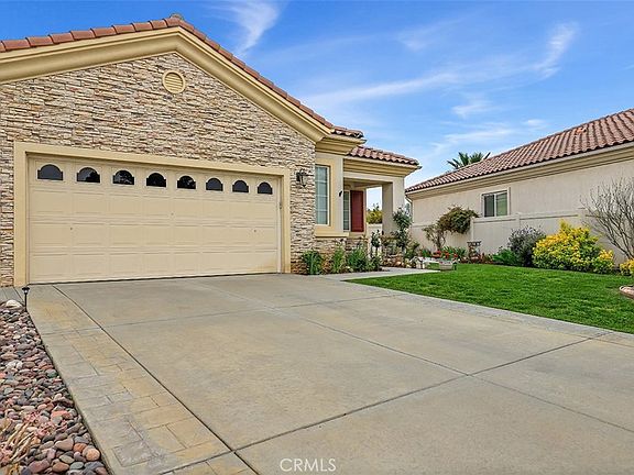 ~~PRICED TO SELL!!~~ Panoramic and amazing mountain views abound from this British-style rose garden and drought-tolerant Zen backyard. Enjoy the mountain vistas north and east while taking in the sunlight. Solera is Beaumont's premier 55+ senior community with gated entry and guard shack. This most popular "Trillion" model is 2 bedrooms plus den/office and 1687 SF. It features a large, flat and private 8276 SF lot. Stacked stone exterior accents. Located on a quiet and peaceful cul-de-sac street. Move-in ready and features 12-inch tile entry, and beige carpet. Bedroom has ceiling fan, high ceilings , a walk -in closet and connects to hall bathroom with diagonal tile floor and single sink. There is a den/office with double doors. Hallway leads to another closet and the Primary Suite featuring high ceilings, ceiling fan, and a large walk-in closet. The Primary bathroom has dual sinks, tub, shower with handicapped accessible handles. The open kitchen has a new refrigerator (refrigerator in garage stays also), corian counters, white stone backsplash, recessed lights, pantry and oak cabinets. Dining area off kitchen leads to Great Room with gas fireplace and media niche. Indoor Laundry Room leads to the large attached 2-car garage with overhead metal storage rack. Additional features include a "Ring" doorbell security camera, a reverse osmosis water filtration system, and double-gated access to the side yard. The backyard oasis awaits with amazing views, Alumawood patio, custom concrete, (3) lemon trees, (1) apple tree, (1) loquat tree, and also features large side garden area with plenty of room for a vegetable garden or home addition. Amenities are gated entry with guard, clubhouse, social clubs, gym, tennis courts, bocce ball, sport court and dog parks. Close to shopping, entertainment. Easy access to 60 and 10 Fwys. Make an appt to view today!