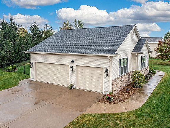 **New lower price!** This well-maintained ranch is located on a corner lot in a family-friendly neighborhood, within walking distance to Fareway, walking trail, small playground, and disc golf course. The open concept living area has vaulted ceilings, features a gas fireplace with blower and decorative mantle. The main level living room, formal dining room, and hallway have beautiful designer laminate flooring. Also on the main level are 3 bedrooms, 2 full baths, and a separate laundry room with white storage cabinets and wire closet shelves. The kitchen features cathedral cabinets with crown molding, an island, pantry closets, breakfast nook, and breakfast bar. Kitchen and Laundry appliances stay with the home. The entryway has tile flooring and a coat closet. The master bedroom is located on the main level and features new carpet floors, a vaulted ceiling, and a walk-in closet. The attached master bath includes bronze sink faucets and hardware, jetted whirlpool tub, and a one-piece shower. Two of the three bedrooms have new carpet. The partially finished lower level features a full bath, huge family/rec room, office/study, and large storage area. The home also features a central vacuum system with a dustpan sweep inlet in the kitchen and a canister in the garage that can be used for cleaning the car interior. Throughout the home, there is painted trim and 6-panel doors, rounded drywall corners, and kitchen and bath cabinetry in maple cordovan. Outside you'll notice the brand-new vinyl siding, gutters, downspouts, shutters, and insulated garage doors, all newky installed in 2021! The front porch is framed by 2 columns and the side of the house boasts a 3-stall side loading garage. This garage has many amenities including deeper stalls for larger SUVs and toys, an extended work area with a large workbench, storage cabinets, and upper attic storage with pull downstairs. Another wonderful surprise is the in-wall heater with a thermostat and a drain for the Iowa cold winters and snow. The backyard features a stunning lighted paver patio and gas fire pit with lava rock and turquoise glass rock. A black vinyl chain link fence surrounds the backyard and the neighbor's trees provide privacy. Other features included with this home is a lawn irrigation system, and a smart thermostat that can be adjusted while you are home or away. This home has been beautifully maintained and cared for and offers a lot of amenities. Great location as it is near I-380 and Highway 100. Call today for a private showing!
