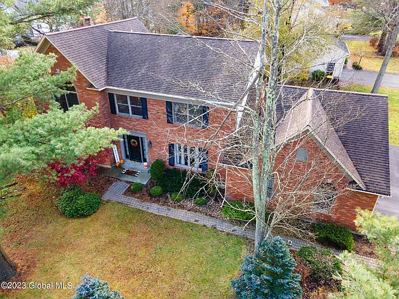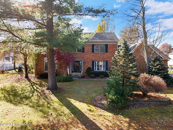 Nestled on a private corner lot in the Guilderland SD sits this grand colonial that is loaded with desirable amenities. From the moment you step into the welcoming 2-story open foyer, you'll experience a sense of home. The kitchen is truly striking, boasting an expansive island adorned with granite countertops and complemented by SS appliances. The kitchen seamlessly transitions into the FR, where a cozy gas FP awaits. Entertain in the formal LR with gas FP, the formal DR, or in the finished rec area in the basement. 5 bedrooms - one conveniently located on the 1st floor. The primary BR impresses with vaulted ceilings and a luxurious en suite. All the bathrooms have been thoughtfully updated. The yard is fully fenced, offering a spacious deck, shed, and patio to enjoy outdoor living!