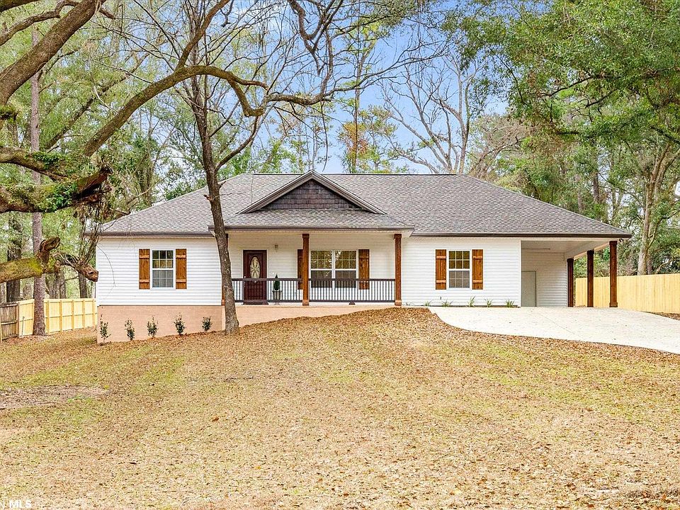 Country Living in the City! This custom, new construction, Gold Fortified, 3 bedroom 2 bath home- sits on over half an acre with NO HOA! Pulling up, you’ll notice the private lot, with mature trees and a new driveway with parking pad. Exterior home features include: low maintenance vinyl, cedar- columns, shutters and shake accent shingles, security lighting and a storage room off of the 1 car carport. Walking through the leaded glass, front door and through the foyer, you’ll find LVP flooring throughout, crown molding in your main living areas and a true split floor plan. Off the foyer, is the 12x15 master bedroom with ensuite bath. The bathroom features include: a dual sink vanity, separate shower, soaking tub, a water closet and oversized walk- in closet with shelving. Your other 2 bedrooms (both 11x13) and full bath, with decorator style vanity, are on the other side of the home. Separating the two, is your open concept, oversized-living room, dining room and kitchen. The kitchen features include: a large center island, with brushed granite accent top and plenty of room for seating and stainless steel appliances. Off the kitchen is your oversized pantry, with accent door, large laundry room and drop zone, by your side entry door. French doors, off the living room, lead you out to the back, covered patio and private back yard. The property line extends past the tree line and is fenced on 2 sides. Fabric Hurricane shutters, for the windows, are included with the home.  ****Note: Living Room, Dining Room, Kitchen (including the refrigerator) and Master Bedroom have been virtually staged.
