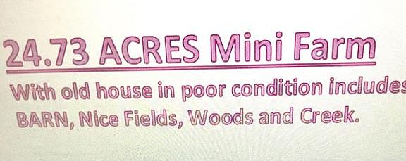 This is a lovely mini farm ** 24.73 ACRES ** it has an old BARN, tractor shed, and a 2 Bedroom house in poor condition,with a walkup attic and a basement. Not sure the condition of the well. The home is sold with the property in it's "As is where is condition". Sellers had the home rented up until this summer. The land is absolutely beautiful, w/ about 8-10 acres open field, the balance in woods. There is a creek shown on the plat. This is a great place! Shown by appt. Zoned Agriculture w/ no deed restrictions. The bulk of the land is in Powhatan, partially in Cumberland County.