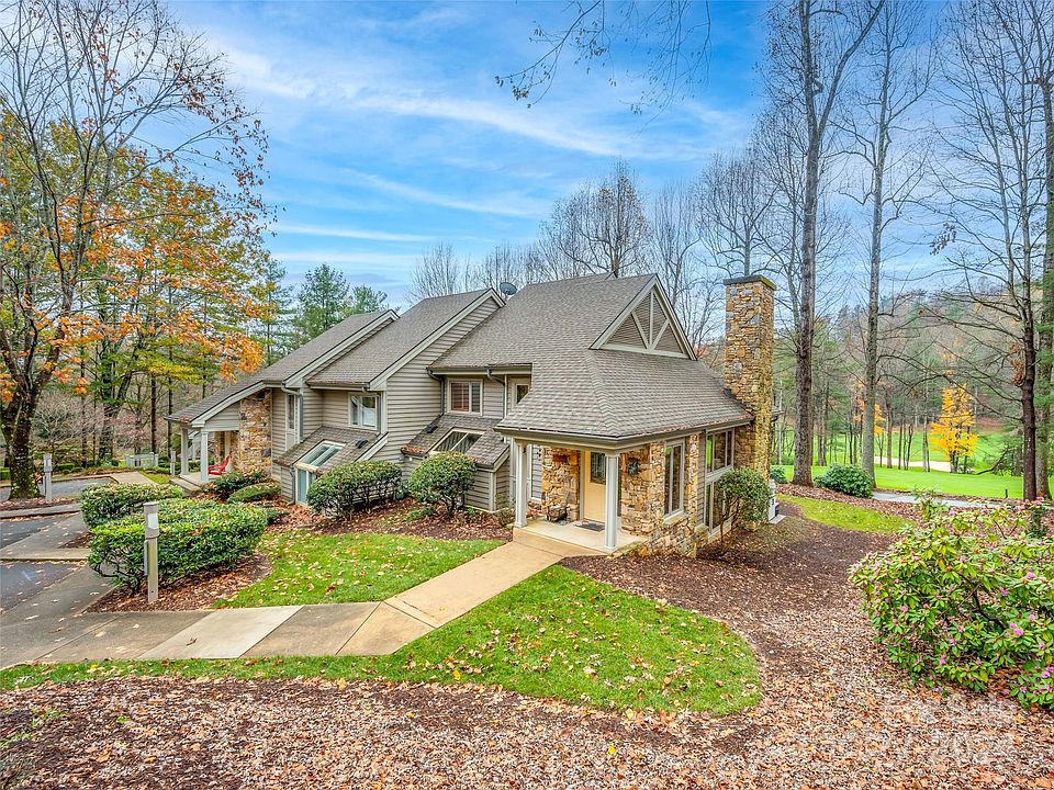 Welcome to a charming villa in the picturesque Champion Hills community, where you'll enjoy breathtaking views of fairways 5 and 6 on Tom Fazio's renowned "Mountain Masterpiece" golf course. This elegant home features vaulted ceilings and a dramatic two-story stone fireplace with gas logs, creating a warm and inviting atmosphere. The updated kitchen, equipped with new appliances, is perfect for enjoying your favorite homemade meal with friends and family, while abundant windows allow natural light to flood the space. The back porch with a retractable awning is an ideal spot to relax and savor the cool mountain air, surrounded by beautifully manicured landscaping. This villa is perfect as a summer retreat or year-round residence, benefiting from POA maintenance that covers the roof, exterior paint, and landscaping. Located just 8 minutes from downtown Hendersonville, it offers both tranquility and convenience. Come and see for yourself what makes this home so special!