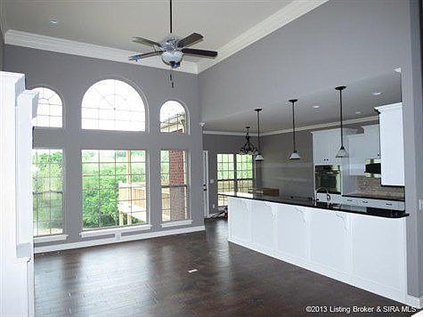 AMAZING SETTING! The AVANTI; on a NICE treed lot. Arches frame and separate the foyer and formal dining. This kitchen completely open to great room with breakfast bar, upgraded cabs, granite counters, tile backsplsh, stainless appliances & breakfast area exits to covered deck with OUTSTANDING VIEWS. Split bedrooms with luxurious master suite has HIS/HERS vanities, & sep HIS/HERS closets, tile shower, whpl in the mstr bath. Lg ANDERSEN windows allow for maximum natural light & 12' ceiling in great room. AMAZING TRIM WORK. *SMART ENERGY HOME & TRANE HVAC, hardwood, ceramic & awesome decor. Fin walkout basement has 4th bdr, fam rm w/ wetbar, full bath. Estimated completion: MAY. One owner is licensed agent. Sq ft & rm sz approx.\n\nInformation Deemed Reliable But Not Guaranteed. Information provided by the Southern Indiana REALTORS® Association, Inc. © 2010 SIRA Multiple Listing Service. All rights reserved. Brokered And Advertised By: Schuler Bauer Real Estate Services ERA Powered [COR] Listing Agent: Patty Rojan
