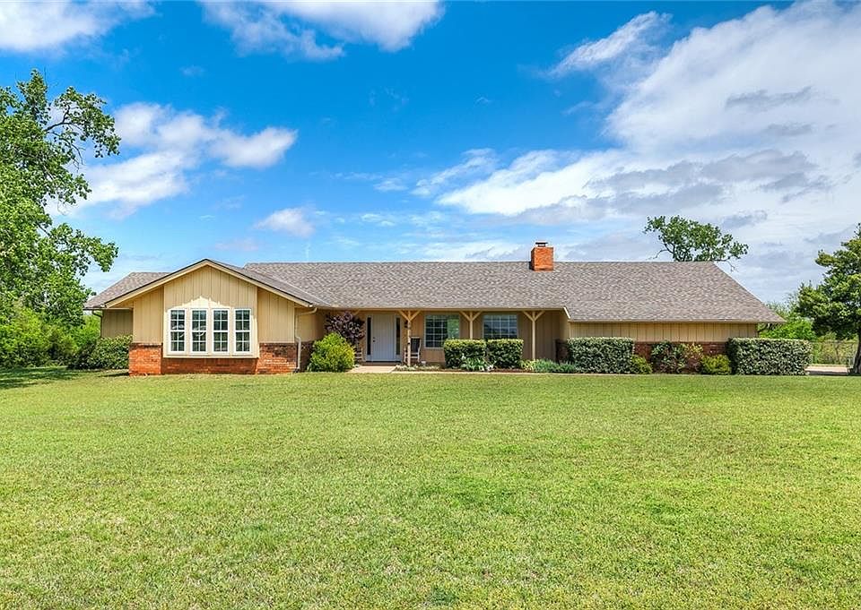 One of Norman's best kept secrets, the Wildwood Hills Addition combines the convenience of close proximity to city life yet provides the peace and quiet of country living. This 3 bed, 2 full bath ranch-style home sits on nearly 2 acres and offers gorgeous views of the sunrise and sunset from the large covered front porch. Inside the home, you'll find two living areas, a dining room, and kitchen with bar top. The laundry room is spacious and has tons of storage. Master bathroom has been completely remodeled and features double vanities! New laminate flooring is found in the living room. The garage features lots of storage space and an in-ground storm shelter. An 8 x 8 tool shed/storage shed is found on north side of property. If you're searching for the relaxation that country living offers coupled with a short commute to Norman, Moore, & OKC, this is the perfect place for you to call home! You won't find another home with expansive sky views like this property offers.