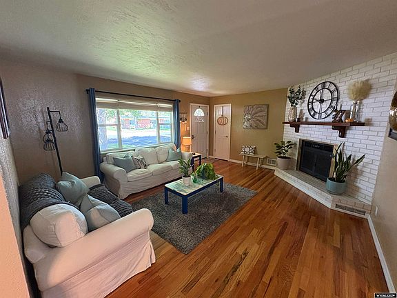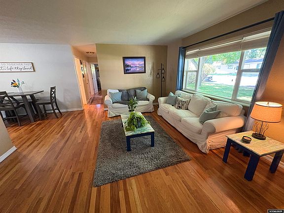 Well Maintained 4 Bed, 2.75 Bath Home. As you pull up to this home, you will immediately be impressed with the pride of ownership! With automatic sprinklers in the front and back, your yard will be the envy of the neighborhood. Entering the home, you will notice the well cared for hardwood floors and new carpet. The main level features all of the bedrooms and bathrooms, two family rooms, the kitchen and the laundry. More spacious than it appears from the street, this home has over 2,000 square feet on the main level—including a private primary suite! The partial basement is a great area to use as a game room or TV/Movie area. The backyard features a covered back patio and a privacy fenced yard—perfect for summer BBQs. Finally, there is an oversized one car detached garage—plenty of space for a vehicle and work/storage area. Call David at 307-851-4629 for your own private showing.