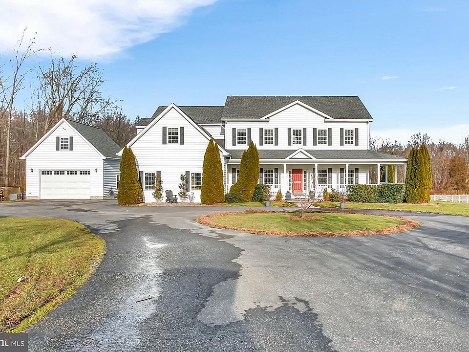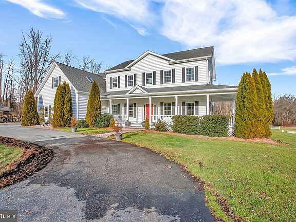 A Better Setting can't be found, Close to Everything but with Land & Privacy!!! Wrap Around Front Porch Colonial Setback off the Road and Situated on over 21 Acres . A 2 Car Side Load Garage along with 2 Car 25' x 25' Detached Garage, Whole House Generator and Geothermal System. Partial Two Story Entrance Foyer with Turned Wood Staircase. Main Level has 10 FT Ceilings, Decorative Moldings and Back Stair Case from Kitchen to 2nd Floor. Open Great Room with Kitchen & Family Room. Separate Dining Room and Living Room/Office. Kitchen has Hardwood Floor, Recessed Lights, Cherry Cabinets with Crown Molding, Granite Counters and Stainless Appliances . The Oversized Island has Breakfast Bar Overhang, Second Sink, Brand New Downdraft Electric Cooktop and Island Lights. Main Level Powder Room, Large Pantry/Storage Closet with Entrance to 5 FT High Crawl Space, Side Door Entrance to Patio, Laundry/Mud Room with Entrance into Attached Garage. Open Family Room with Hardwood Floors, Brick Raised Hearth Fireplace, Recessed Lights, Ceiling Fan and 2 Sets of French Doors with Transoms above leading out to Deck. 1st Floor 5th Bedroom/Office with Full Bath (Glass Shower Enclosure and Barn Door Entrance to be Installed) and Closet has French Door to Deck. Upper Level has 9 FT Ceilings and Second Family Room with Staircase down to the Kitchen and Full Hall Bath. Double Door Entrance into Spacious Primary Bedroom Suite with Cathedral Ceiling, Recessed Lights & Ceiling Fan. Double Door Entrance into Walk In Closet with Built In Ikea Closet System. The Primary Bath has Heated Ceramic Tile Floor, Double Vanity, Jacuzzi Jetted Tub and Separate Shower with Side Jets. Bedroom 2 has a ceiling Fan and a Walkthru Walk In Closet, Bedroom 3 has a Built In Wardrobe and Chandelier. Bedroom 4 has Double Wall Full Wall Closet. Maintenance Free Trex Deck with Vinyl Railing and Stairs down to yard.