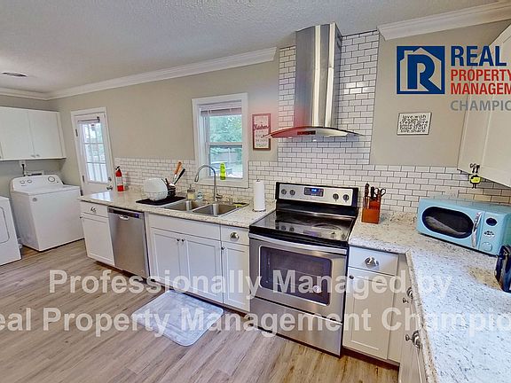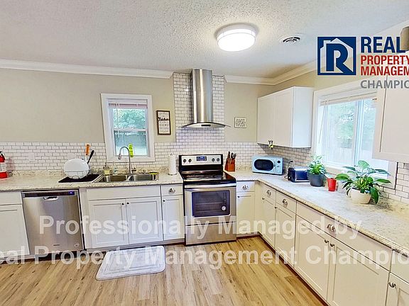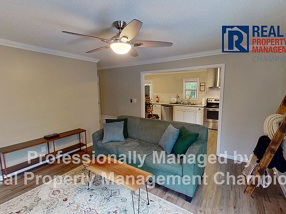 This charming home features 3 bedrooms / 1.5 baths and is filled with lots upgraded features. Beautiful wood-like LVP flooring flows from the foyer through the living room and kitchen. Decorative crown molding and window blinds are throughout. The kitchen offers plenty of space to cook with loads of counters and plenty of cabinets, decorative tile backsplash, stainless steel appliances and a laundry area with additional storage cabinets and room for your own washer and dryer. Cozy carpet is found in the three generously sized bedrooms. The main bedroom includes a private half bath and access to the back deck. The second bedroom includes a 10x11 sitting area or office. The third bedroom includes a double window overlooking the front yard. The full bath has been tastefully updated with a new vanity, solid surface counter and decorative mirror. The tree lined fenced back yard has space for all of your outdoor activities on the lawn or on the oversized deck. Paved driveway for off-street parking and a storage shed in the back yard are added features. Located in the popular Northwoods neighborhood, convenient to area bases, shopping and dining.