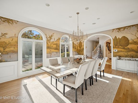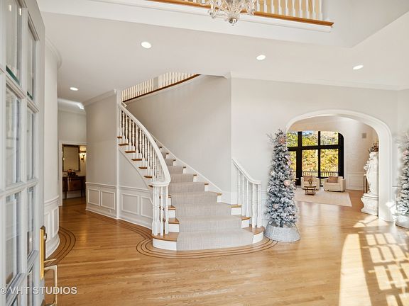 This incredible home on 1.25 acres and landscaped to perfection, offers the perfect retreat to relax and unwind. The magnificent wooded grounds offer a luxurious swimming pool, expansive bluestone patio, fire pit and tiered decks that show off the surrounding ravines, wildflowers and seasonal views of Lake Michigan. It is the perfect spot for outdoor entertaining. The driveway takes you over a private stone bridge that brings you to this amazing home. There is a magnificent 2 story foyer and staircase that lead to the grand room with incredible chandeliers hanging from the 20 ft ceilings, a wet bar, fireplace, and windows that overlook the ravines. The recently renovated eat-in kitchen offers high-end stainless steel appliances, oversized island and a wood-burning fireplace. Adjacent is a 3 season screened porch. The dining room is another perfect place to entertain with a butler's pantry. The family room reveals views to the swimming pool. A 1st floor primary bedroom offers a place to sit with high ceilings, walk-in closets, and a bathroom with grand shower, soaking tub, heated floors and skylights. The main floor office boasts wood-paneling, custom built-ins and fireplace. Main floor laundry room. Two powder rooms and a mudroom are also located on the main floor. The second floor includes four large bedrooms (2 en-suite and 1 Jack & Jill) with updated bathrooms. Also on the second floor is a cozy secluded loft type office and a walk-in cedar closet. The lower level walk-out includes in-law suite with it's own entrance, kitchenette, bedroom and bath. The English basement features a rec room with pool table, fitness area, powder room, craft room and added storage. The lower level deck includes a newly installed gated dog run, a place to relax with ravine views. Don't miss the heated garage which can accommodate 6 cars and adds close to 2000 sq. ft of space. A car collector's dream. This is the perfect suburban retreat to call home. Perfect for quiet nights or entertaining your family and friends. All will enjoy the grand indoor space, but will be in awe of the grandeur that the outdoor space offers.