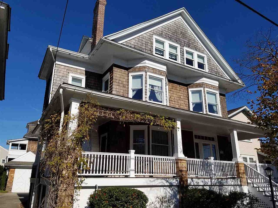 Classic 1905 cedar shake Cape May home on desirable Stockton Street, 1 block to the beach and steps to town. Substantial wrap around porch with columns and gardens surrounding this beautiful home. Truly one of the best porches in town. First floor offers full length living room with brick fireplace, large windows, impressive newel post and double sided staircase, and archways to large dining room lined with windows. New Chef's kitchen with granite, upgraded appliances, custom hood, wine rack, tile backsplash and stainless steel appliances with an eating area overlooks the private back yard. There is a new bathroom with stylish tile shower and wainscoting. Second floor offers 4 large bedrooms, additional walk-through bedroom and 2 full baths with claw foot tubs and large porcelain sinks. The third floor offers 3 bedrooms with window seats, a full bath, and a kitchenette and dining area. Full basement, long driveway, detached garage and landscaped rear yard. AC split systems on first and second floors and gas heat. A true Cape May Classic.
