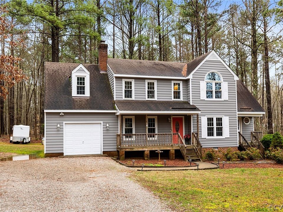 First offering by the original owners, this lovingly maintained home is situated on 2.96 park-like acres with its own nature trail. Convenient location in Powhatan's beautiful Timber Trace neighborhood, the home has updated windows, siding, roof, heat pumps, and front and back doors, garage door and composite deck. The main level features a spacious great room with brick fireplace with gas logs and access to the rear deck and attached garage. The eat-in kitchen has sunny dining area overlooking the private setting. The laundry room has cabinetry and access to the side porch. Upstairs, there are three bedrooms and two full baths including a the primary bedroom with vaulted ceiling, sunny palladian window, large walk-in closet and private bath with double vanity. There is potential for a bonus room in the unfinished area above the garage which is currently used for storage. With almost three acres, the property is well suited for pets and has perimeter invisible fencing installed. X-finity high speed internet.