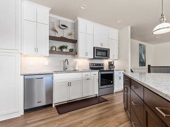 Custom-Built Condo 2 years better than new! Extras Extras! Open concept living, barrier free design, Zero entry. Maintenance free exterior. Foyer w/ Large closet leads you to the White kitchen w/quartz counters, LVP Floors open to the Living Room with it's Door County stone, gas FP. Large window and Sliding door frame your view of the Pond. Enjoy the Sun Room or use as Office w/ pocket doors! Primary and Guest BR on the Main w/ 2 full baths! Finished bedroom on LL w/exposed windows and Full Bath! Huge unfinished Storage area as well! Designer-chosen finishes, extra Insulation between rooms, Radon system, gutter covers, concrete curbing around Garden Beds. Perennial Garden next to Deck off the Dining Area. Custom Window Coverings. Lights in Closets, Finished Garage. Seller is Licensee
