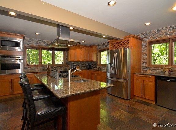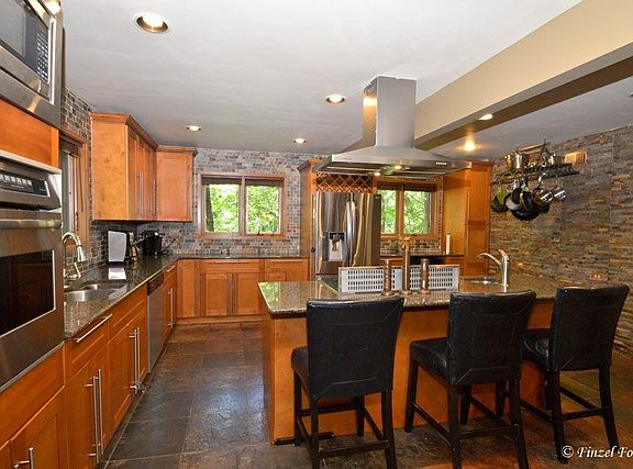 Awesome!! Completely remodeled hillside home. Living here would be like your always on vacation. High-end island kitchen with custom cabinetry, granite, slate flooring and commercial appliances. All updated bathrooms, gleaming maple hardwood flooring, and soaring ceilings. Large and inviting open family room with 1 of 2 different wood burning fireplaces. Steam and sauna room, screened in porch, media room. Almost an acre of of wooded property with a beautiful waterfall. New extra large driveway brings you into a huge 3 car garage. A very custom home that is truly 1 of kind in the area.