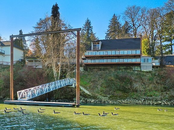 This gated Willamette Riverfront retreat offers exceptional privacy and panoramic views throughout. Inside, enjoy soaring ceilings, gleaming hardwoods, quartz countertops and a flexible lower level with potential for a fourth bedroom. The dramatic loft features a wet bar and an outdoor balcony—ideal for entertaining. Listen to the year-round waterfall as you walk down the steps that lead to a new gangway and private boat dock. Wake up to stunning sunrises and unobstructed views of the Waverley Country Club golf course and the river below. Every room offers a front-row seat to the Christmas ships, Fourth of July fireworks, sea lions, eagles, and more—visible through a dramatic wall of river-facing windows or from the many expansive decks. A large carport with stair access leads to 444 square feet of attic space with high ceilings, offering excellent expansion potential. Located in the prestigious Dunthorpe neighborhood. Plus, the seasonal Historic Willamette Shore Trolley is able pick you up at your front door, allowing easy access to downtown Lake Oswego or a scenic ride to Portland’s SW Waterfront.