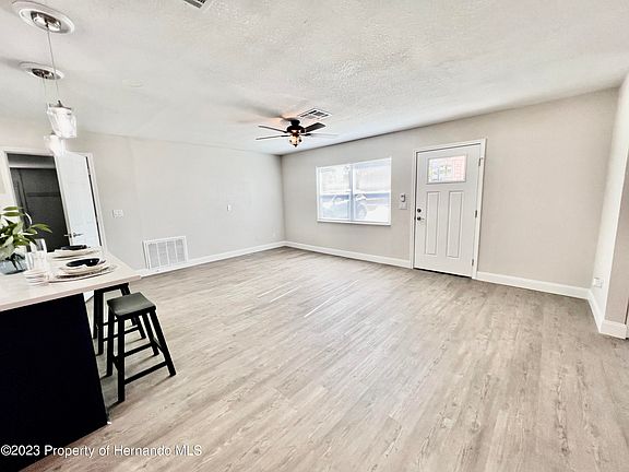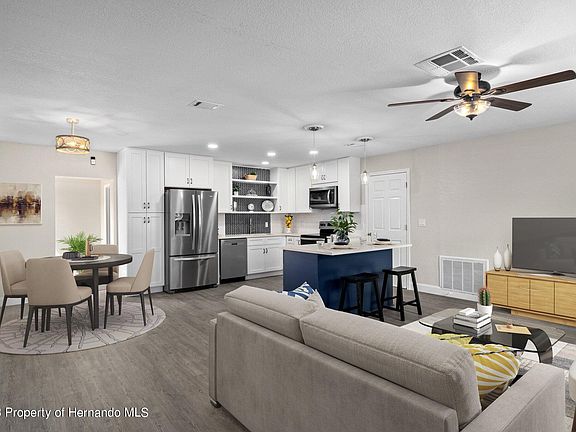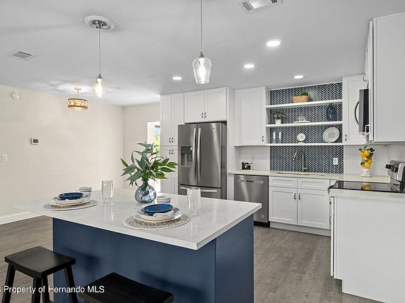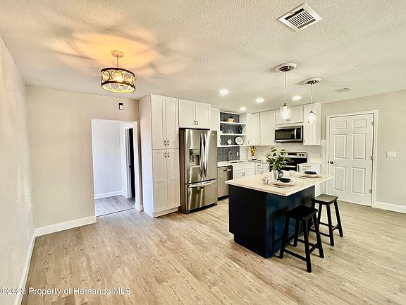 Upon entering through the new front door you'll find a free flowing open floor plan; perfect for entertaining. The kitchen features all new Stainless Steel appliances, stylish herringbone tiled back splash, new wood cabinetry with soft close drawers, pantry, quartz countertops, sizeable center island with additional storage and a dining area open to the generous living room.