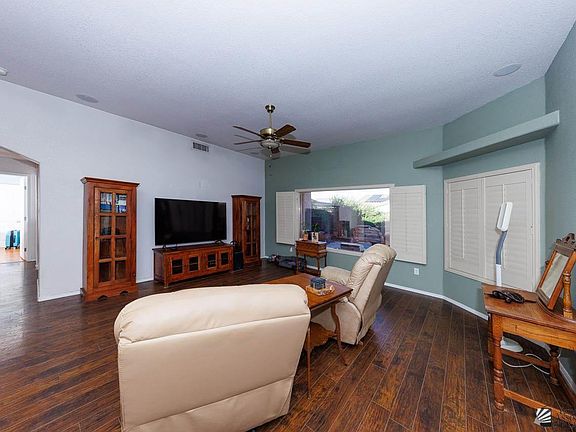 4 car garage in this Gorgeous Solar Estrella Home with relaxing Spool/Spa in tropical backyard. Freshly painted interior and exterior areas of the home. A/C and heater less than 1 year old with transferable warranty. Beautiful wood flooring and upgraded plantation shutters throughout. Freshly painted 4 car tandem garage that opens up to backyard - plenty of room for cars and toys. Spacious shed in backyard. Brand new tankless water heater. Surround sound and Culligan water softener. Solar is paid for.