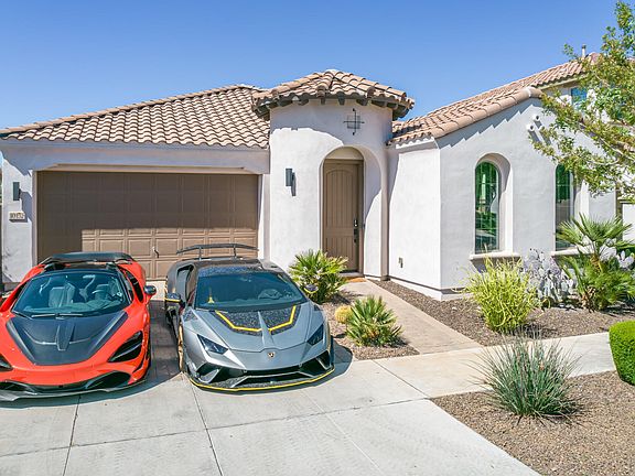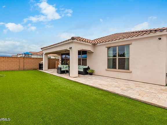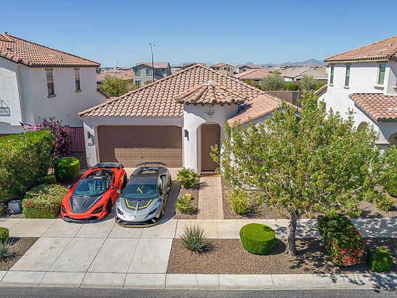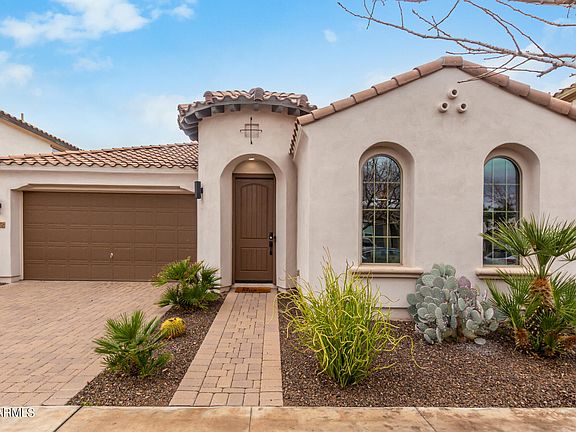 Start living in this gorgeous 3 bed, 2.5 bath home in Eastmark! This Spanish-style beauty features low-care landscape & a 2.5-car garage w/paver driveway. Highly-upgraded interior boasts wood-look floors, surround sound, vaulted ceilings, archways, custom walls, & an ample den great for a formal living, office, etc. Sliding doors leads to the backyard from the great room, merging the indoor/outdoor living & making entertaining a bliss! Elegant kitchen includes staggered cabinets, a pantry, SS appliances, granite counters, subway tile backsplash, & an island w/breakfast bar. Primary suite enjoys a private bathroom w/dual square vessel sinks, a walk-in closet, & large shower. Take a break in the relaxing backyard offering a covered patio with beautiful travertine. Make an appt to see today!