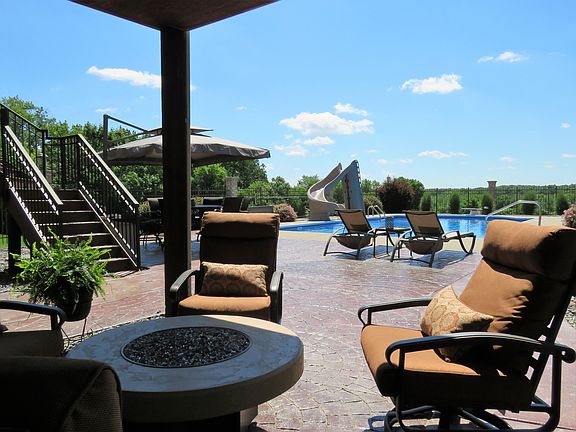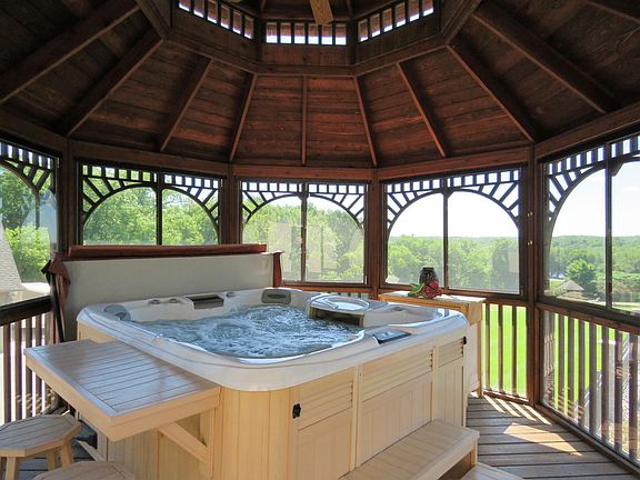 WOW~This one has it all! Beautiful two-story on almost 3 acres with 3 car garage, tuck under garage and 30'x60' fully finished detached garage with office, bath, mezzanine level, floor drains, heat, epoxy floors-9 garage stalls total, in-ground heated swimming pool, huge maintenance free deck with metal railing, gazebo with hot tub all with a commanding view of the river valley. Home has been meticulously maintained and offers an inviting two-story foyer, spacious kitchen with huge island, newer stainless steel appliances, granite countertops and tile backsplash. Main level family room has stone, gas fireplace with built-ins, office/bedroom with 3/4 bath, convenient laundry, mudroom and four-season sunroom with a million-dollar view. Newer carpeting, fresh paint, new driveway, brand new pool liner, stamped concrete front walkway and back patio, security/camera system all professionally landscaped with mature trees and irrigation system. Sure to impress!