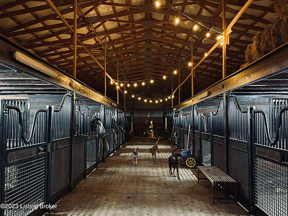 This move in ready horse farm with an impressive 10 Stall Show barn featuring 12' x 12' stalls from Saratoga. It also includes a large tack room with drawers for storage, a hot/cold large sink and fridge. There is a full bathroom, (washer/dryer included) along with utility/storage room. Alongside the barn is a huge riding arena and round pen. Also on the property is a smaller barn currently being used as a workshop, and another 36' x 30' covered shed.