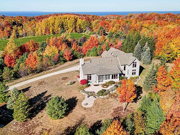 The Views! Wake each day to sweeping countryside vistas with peaceful views of Grand Traverse Bay in the distance, creating a serene and ever-changing backdrop to this thoughtfully designed home. Designed by architect Robert Holdman and built by Webster Construction, the residence reflects quality craftsmanship and timeless design throughout. Inside, the main level offers comfortable one-level living with a primary bedroom suite, laundry room, and an open, inviting layout accented by beautiful maple hardwood flooring. The very spacious living room features a wood-burning stone fireplace, providing a warm and welcoming space for everyday living and entertaining. The kitchen is both functional and inviting, offering a spacious walk-in pantry with exceptional additional storage, and opens to a charming screened porch — the perfect place to start or end the day while enjoying the surrounding natural beauty and the flower filled garden. Upstairs, two additional bedrooms, a light-filled and airy office space, and a 3/4 bath provide flexibility for guests, work-from-home needs, or creative pursuits. The lower level adds yet another special feature with a dedicated wine room, ideal for collectors and entertainers alike. Outside, the property continues to impress with naturally inspired landscaping, including a variety of wildflowers that are thoughtfully mowed once a year to allow for reseeding and seasonal blooms. A productive vineyard adds both character and charm to the land. The home includes a two-car attached garage, along with an additional detached one-car garage featuring an integrated greenhouse, offering unique space for gardening enthusiasts, hobbies, or storage. All of this is ideally located just minutes from the heart of Northport — a truly charming town known for its boutique shops, New Bohemian Cafe, Tom’s Market, gas station, (just to name a few) and small-town coastal appeal.