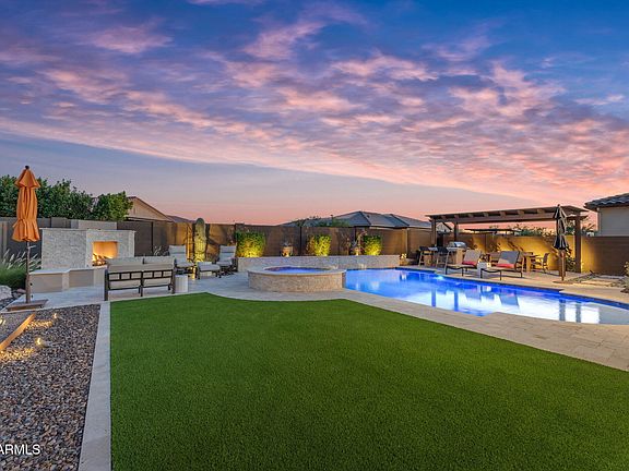 Discover luxury living in Eastmark, a unique community offering a small town feel with resort style amenities including a stunning pool, parks, Steadfast Farms, trails, schools, and more. Eastmark is truly one of a kind in Arizona, providing everything you need with convenient freeway access, shopping, dining, top-rated schools, and more. This beautiful home is perfectly situated across from a grassy park on a rare, expansive 10,000 square-foot lot. The backyard is an entertainer's dream, featuring a pool, spa, outdoor kitchen, and a spacious patio ideal for gatherings with family and friends. Inside, you'll feel as though you've stepped into a model home, with a gourmet kitchen, a large island, ample storage, upgraded appliances, and stunning backyard views. The home is packed with upgrades, from energy-efficient roller shades controlled at the click of a button to an open and bright floor plan. Enjoy a private primary retreat, a large den perfect for an office or potential bedroom, and a private guest suite with its own bathroom. The garage is a storage haven, complete with custom cabinetry. There's so much to love about this exceptional home and the vibrant Eastmark communitydon't miss out on the chance to make it yours!