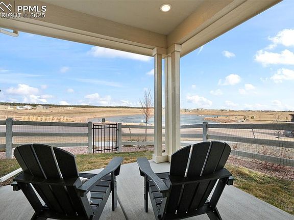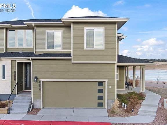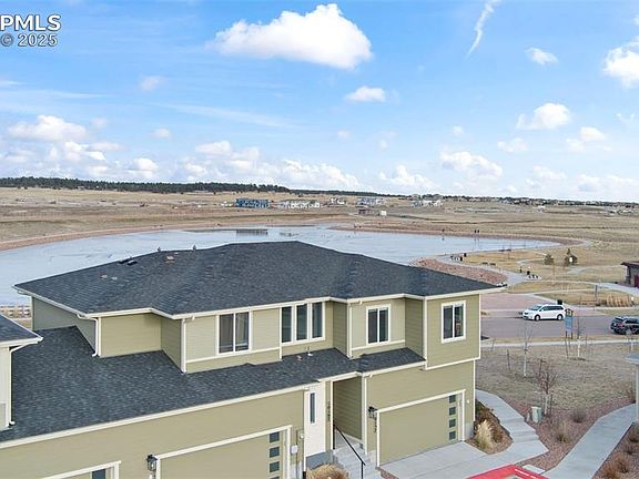Absolutely incredible town home near the Wolf Ranch Lake! You will feel like you are living in a mountain town/beach home! So relaxing! This end unit has so much natural light! The welcoming entry has a covered porch for relaxing and enjoying the sunrises over the lake! Enter to a an open floor plan and luxury vinyl plank floors through the main level! The main level family room has a modern fireplace and calming sitting area! It opens to the kitchen for easy entertaining! The kitchen has upgraded cabinets, quartz counters and a good size pantry! The kitchen opens to a large dining room with walk out to the back covered patio with more amazing views of Wolf Ranch Lake! Fenced yard included! Half bath on the main level as well! Upstairs you will find three bedrooms, a full bath and large laundry room! The private master bedroom retreat has more incredible views of the lake, barn door to the spa like master bath with spacious shower and massive walk in closet! Two more spacious bedrooms have picturesque views of the Pikes Peak! Full bath has quartz counters! Upstairs laundry as well! All this with an attached two car garage, walking trails, award winning schools, dog parks and playgrounds galore! You are going to love living in Wolf Ranch!
