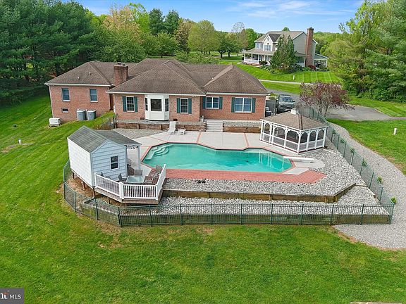 Quality custom-built all brick rancher nestled in a serene two-acre setting in the sought-after “Hereford Zone”. Just 2 miles, (5 minutes), to I-83 at Middletown Road. These original owners designed the home and the giant family room addition, all with quality and pleasant, peaceful living in mind. The home backs up to conservation land providing perfect treed views from the large entertaining oasis enhanced by the 44’x18’ concrete (heated) pool with an in-floor cleaning system, screened gazebo, hardscape, decking, fencing, pool bar and more. This home is truly one-of-a-kind, showing pride of ownership, and the amenities are too extensive to list them all here. Highlights include Updated kitchen and baths, huge family room addition, Canadian oak flooring, brand new carpeting (2023), giant clubroom, two bonus rooms on lower level with full updated bath (perfect for office/hobby and/or bedrooms). Plus, a large bright gym with professional equipment. Updates and quality planning abound: Newer (2016) energy efficient HVAC top-of-line Carrier 3-zone (propane) heat and (electric) a/c system, with a return in each room, new (2016) hip roof with 50-year architectural shingles, new (2020) hot water heater, 400 amp electric, Andersen windows, modern lighting, 9’ ceilings, crown moldings, granite, ceramic, brick wood-burning fireplace, closets galore, new (2023) Maytag washer/dryer, garage with convenient entry to kitchen, custom ‘Keener Kitchen’ cherry cabinetry, granite, stainless appliances, double ovens, Jenn Air gas downdraft cooktop, custom maple cabinetry at bar in living room, wired surround sound, French doors, main-level laundry, light-filled and neutral décor, Generac Generator, awesome outbuildings, no HOA and so much more. See Listing Agent for more details. This one is a must-see.