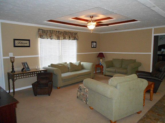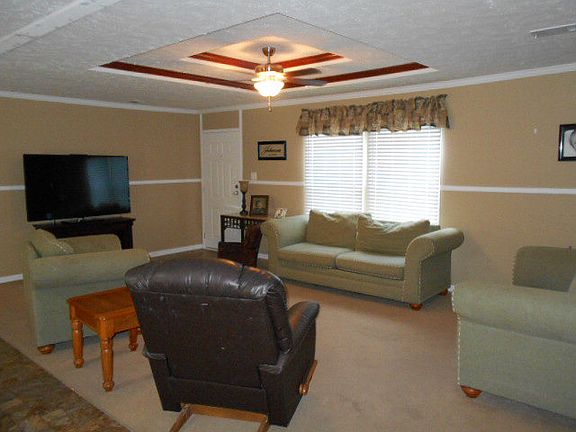 4 Bedroom 2 bath 2200+ sqft mobile home nestled on 15+ acres over looking pond. This spacious, open floor plan 2012 mobile home has a nice kitchen with an island and appliances, dining area, Livingroom and den. Large master suite with walk in closet, garden tub and separate shower. Back deck and fenced in area perfect for small childeren to play. 2 18X20 metal carports. There's also an area up front with septic tank, water hook up and power pole for another mobile home. Odum school district!