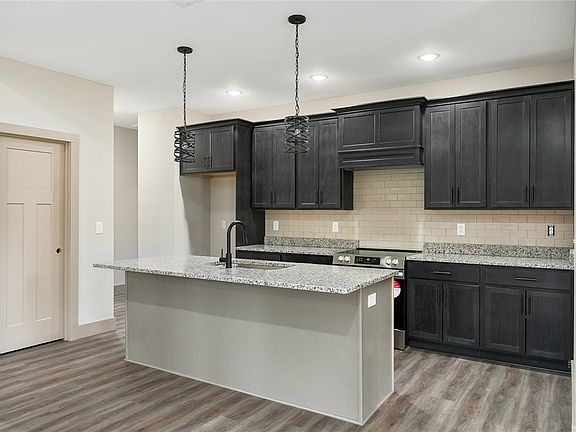 *Delight in culinary creations in your custom-designed kitchen equipped with granite countertops, a central island, tile backsplash, stainless steel appliances, and a chic hood over the stove.
