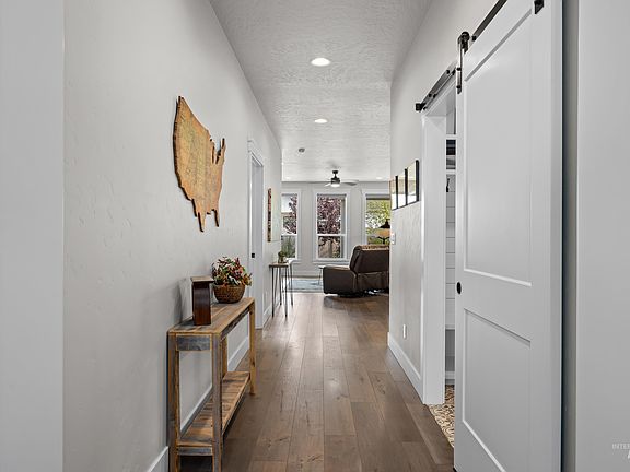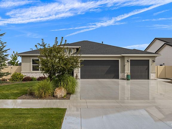 Striking single level corner lot home in Kuna's premier community, Patagonia, like-new built in 2022. Boasting 4 bedrooms, 3 bathrooms, and 3 car garage. Bright and open floor plan with banks of windows in living areas and the master suite. Luxury wide plank flooring through out the living areas, master, and guest suites. Gourmet kitchen with 10 foot quartz island, custom cabinetry, high end stainless steel appliances including a five burner gas range and two ovens. The guest suite with ensuite bathroom provides convenience and privacy for guests or multi-generational living. Sliding glass door leads to four season indoor/outdoor living at it's finest under an extended covered patio and adjacent concrete and stone paver patios. Professionally landscaped with low voltage lighting in front and back yard. No expense spared in adding trees, grass, boulders, river rock, and other materials to create this personal oasis. Patagonia offers two pools, activity paths, green spaces, and a soon-to-be-city park.