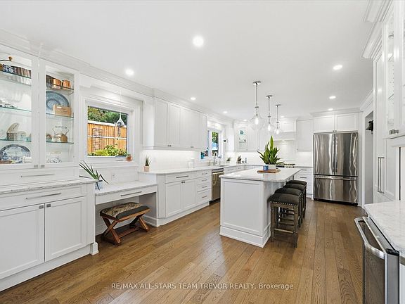 Stunning Detached Home with Heated In-ground Saltwater Pool! This impeccably updated home offers luxurious living inside & out, located on a quiet, highly sought-after dead-end street minutes from Hwy 404, the new Costco, & all town amenities. 5+1 bedrooms, 4 beautifully renovated baths & finished basement, this home checks every box. Step inside to a grand entrance featuring coffered ceiling, crown moulding & hardwood staircase. The main floor showcases new hardwood & tile flooring, LED pot lights, sunken family room with custom built-in cabinetry, LED lighting, walnut mantle, & cozy wood-burning fireplace. The heart of the home is the huge custom kitchen, designed for entertaining & everyday living with a large island, bar fridge, coffee station, desk area, quartz countertops & stainless appliances. Adjacent is a stunning powder room featuring custom walnut vanity & quartz countertop. Upstairs, the primary suite is a true retreat with double walk-in closets, hardwood flooring & luxurious ensuite offering a large walk-in glass shower, double quartz vanity, heated floors & LED lighting. The main bath also features quartz counters, custom vanity & new tile. The finished basement includes a spacious rec room with built-ins, gym with rubber flooring, an additional bedroom & 3-piece bathroom with heated floors. Step outside to your private oasis! Enjoy the heated in-ground saltwater pool with fountains, interlocking stone patio, electric awning & fully fenced yard for complete privacy. Professionally landscaped with gardens, hardscaping, landscape lighting, soffit pot lights & built-in irrigation system. BBQ hookup & generator panel/port for peace of mind. Additional features: Smart panel with LED colour-changing lighting, 200A electrical upgrade with surge protection, Heated garage, Updated windows, doors, trim, Laundry room with quartz counters & stackable washer/dryer. This home is move-in ready, meticulously maintained & shows 10+ with pride of ownership!