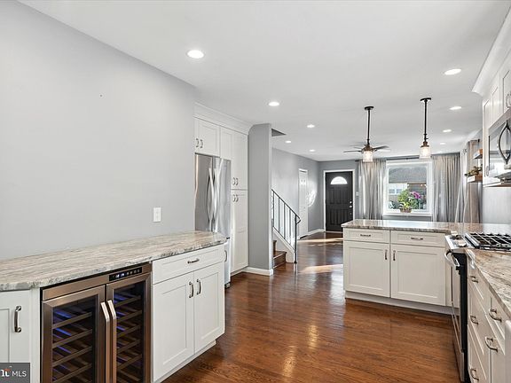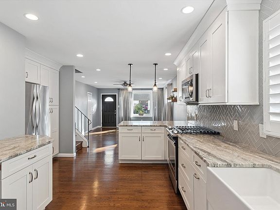 Welcome to this meticulously updated 3 bedroom Glenside home. First level is an open concept with a sunny living room with a large bay window and recessed lighting. The stunning updated kitchen has all the bells and whistles you need, including a deep farm sink, built in microwave, marble countertops, stainless steel appliances, built in wine cooler, and a breakfast bar with hanging pendant lights. Hardwood floors. Second level down leads to to a beautiful finished family room with a separate entrance and mud room, and a fully updated full bathroom. There is also a partial basement with a washer and dryer. The third level consists of 3 good sized bedrooms, all with ceiling fans. You will feel like you are in a spa in the updated hall bath. Backyard is fully fenced(2023) with a large shed and patio. Central air. Great neighborhood close to shopping and transportation!
