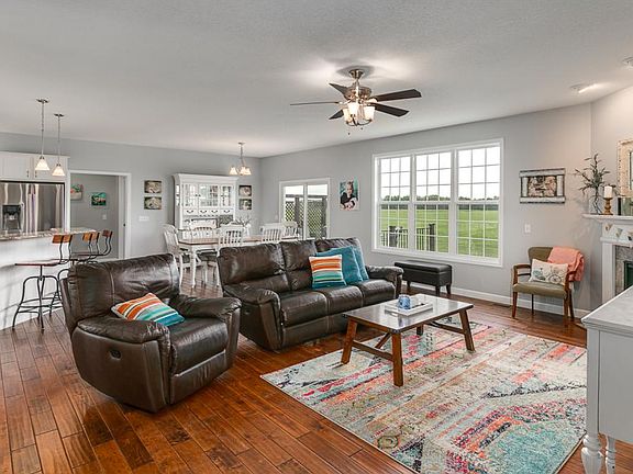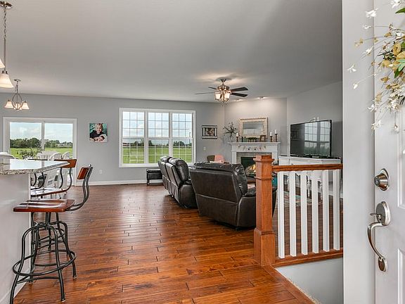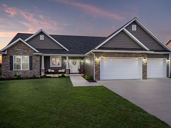 Stunning Craftsman Style home in impeccable condition! This home is better than new and boasts a fantastic open floor plan. Gorgeous engineered wood flooring throughout the spacious great room, dining and kitchen areas. Gas fireplace in the great room. 9' ceilings throughout main level. Kitchen has tons of cabinetry, granite counter tops, large center island and stainless steel appliances. Sliding glass doors from the dining area lead to a nice multi-level deck. Main floor master suite with private bath, double bowl vanity, walk-in shower and walk-in closet. You will love the built in cubbie unit in the rear hall area. Its the perfect spot to keep things organized. The rear hall is located between the three car garage and the utility room. Nice built in desk is located in the rear hall and will stay. Two nice bedrooms and another full bath are located on the opposite wing of the master providing a nice private retreat for the master. The lower level includes a game area (listed as rec room in dimension list) and family room, a 4th bedroom with full egress window and a beautiful guest bath with granite topped vanity. The rolling barn doors open to a large storage room with built in shelving. This home is finished with the perfect touches. Nicely landscaped and nestled in a great, in town location. Home has exterior video surveillance system which could stay. Note: The garage cabinetry does not stay.
