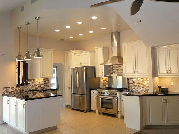 This home is close to the park & pool and is on a cul-de-sac. You will see the landscaping, tile roof & the 3-car garage as you approach. As you enter you will notice the high ceilings have been scraped & the flooring has been replaced. The floors are tile or laminate with carpet in the bedrooms & living room. There are 4 bedrooms & 2 1/2 baths... everything has been totally renovated. There are two living areasâEUR¦both with fireplaces. The kitchen has a Thermador chief's range, newer cabinets, granite, glass backsplash, stainless appliances to include a microwave & fridge. The kitchen is large and trendy! The master bath has a garden tub, shower & two sinks. The master bedroom has 2 closetsâEUR¦one is a walk-in. The renovated guest bath has granite & a shower/tub. You will see fans, newer dual pane windows & an inside laundry. Three car garage is finished with auto door openers that are programmable with an internet connection to your smart phone. Outside is a patio with an area of grass for the kids & dogs. The cooling is a MasterCool in separate ducting. The gas heater has separate ducting which would allow the addition of an AC unit. This home is move-in ready!