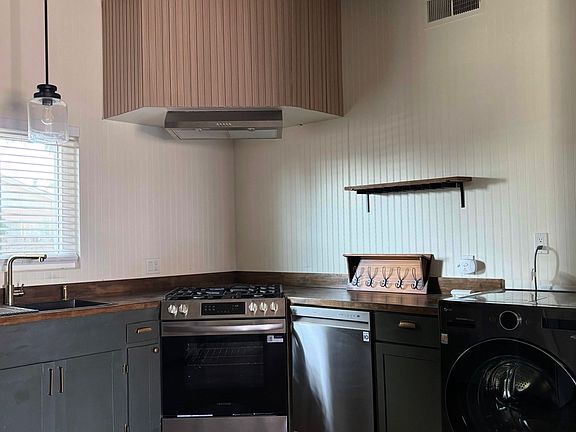 The kitchen is as functional as it is stylish, flaunting a large single-basin sink with a detachable drying rack, a pull-out cutting board, and generous counter space. An all-in-one washer and dryer unit adds modern efficiency while saving space.