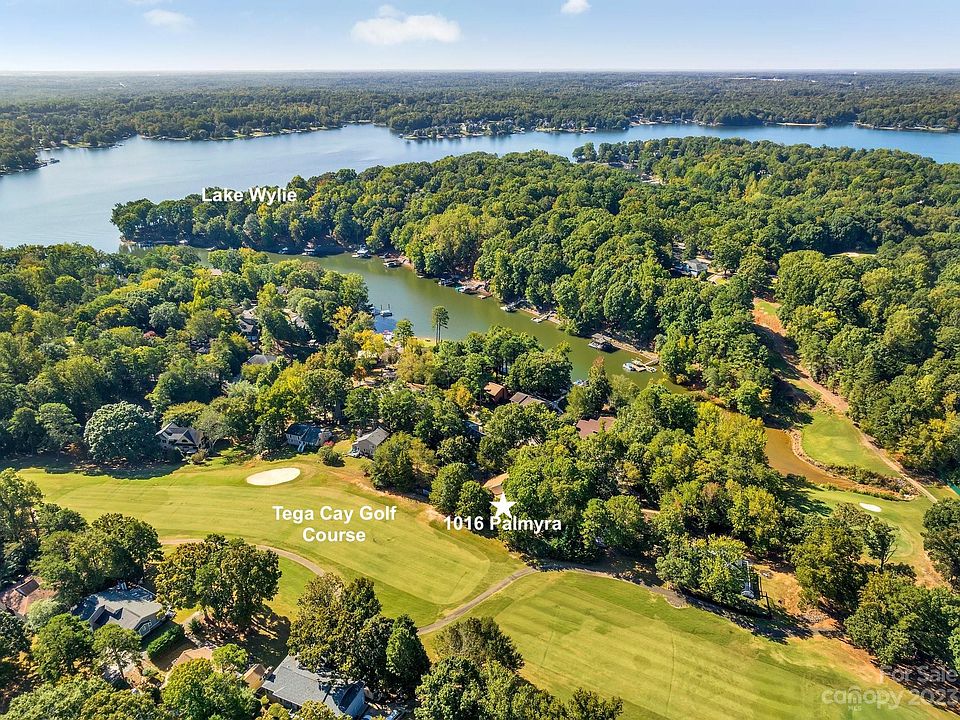 On the Golf course, Tega Cay, SC on the peninsula! Primary Bedroom on the Main, fenced backyard & Two story Great Room with fireplace. Everything you need is on the main floor. Upstairs are 2 bedrooms, plus a 3rd bedroom/bonus/ office. House exterior repainted 2022, new side deck, back deck needs repair. Lake Wylie is right across the street with a public park & playground on Palmyra. This home sits at the end of a shared driveway with extra parking. Roof approx 11-13 yrs, HVAC approx 5 yrs, Hot water tank, 50 gal approx 8 yrs. Tega Cay is a city on a peninsula of Lake Wylie. Amenities include beaches, waterfront parks, boat ramps, community pier, sport courts, recreation fields, walking trails, pickleball, tennis, Tega Cay Beach & Swim Club, Tega Cay Marina & Tega Cay Golf Club, etc. Fort Mill Schools, please verify current school assignment with district for enrollment freezes & info, GHMS freeze possible. No HOA. On the Cove course hole #3.