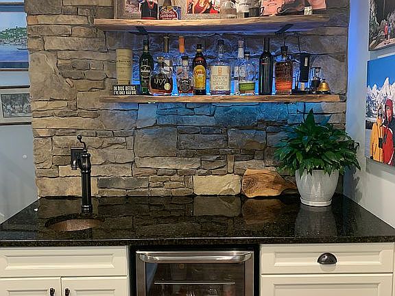 Stoned fireplace and bar with bar fridge