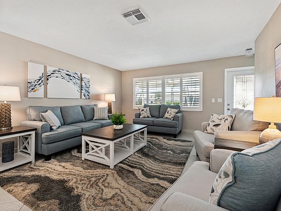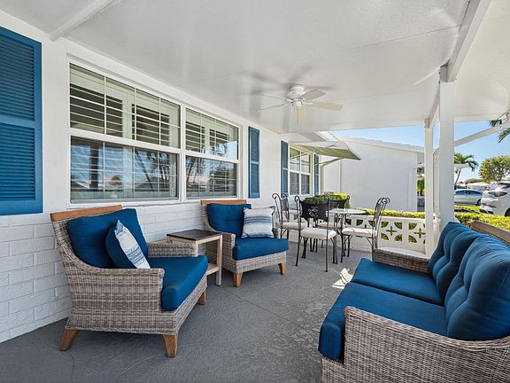 Boater's delight. Ideally located on main E-4 canal with dock plus davits. Exquisite Edgewood 2Br/2Ba with full Florida room. Front and back porches with insulated roofs. Kitchen cabinetry all replaced plus extra cabinetry. Recessed lighting. Updated appliances and corian counter tops. Roof replaced 2015. A/C replaced 2019. Neutral tile thru out.Electrical panel and wiring replaced. Most windows replaced with hurricane impact windows. Front and Back doors are hurricane impact. Plantation shutters. Bathrooms both updated. Thousands in upgrades. Owner will consider selling furnishings separate. Paid up recreation lease in full. One of Leisureville's finest homes.. A Must See..