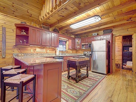 SUNSET VIEW, 2BR, 2BA cabin just 3 MILES TO DOWNTOWN Blue Ridge in quaint, established cabin community. This cabin has been LOVINGLY CARED FOR and updated so it is READY for family Vacation place or Rental opportunity! Beautiful LONG RANGE mountain view, on 1.7 acres of gentle, walkable land. Granite counters, Stainless Steel Appliances, Hot Tub, Fire Pit, Butcher Block Island, Stylish Barn-Red kitchen Cabinets, Vaulted ceilings, Tile shower wall, GAS Fireplace, cedar shake shingles on exterior and so much more! Sold Turn Key with furnishings under separate bill of sale. This won't last more than a Country Minute!