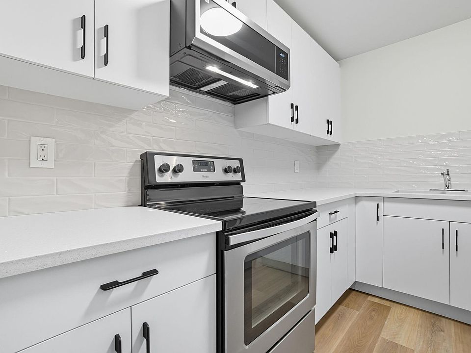 Renovated kitchenGorgeous white cabinetryQuartz countertopsSs appliancesNew tile backsplashLarge closetSerene central courtyard