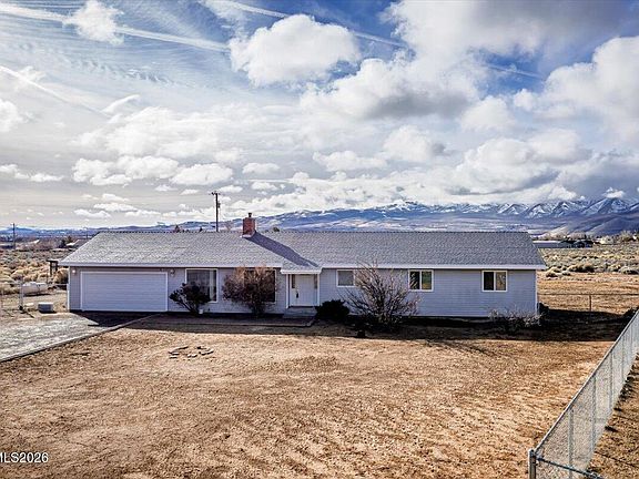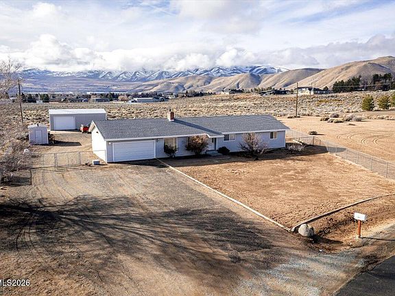 Find your heaven on this level 1 acre lot in the Silver Knolls community in north Reno! This home features 4 bedrooms and 2 baths. The entry foyer opens to a wonderful formal living room with vaulted wood beam ceilings large windows and a fireplace. Family room has vaulted wood beam ceilings and a wood stove as well as a custom oversized slider that perfectly frames amazing views of Peavine Mountain. The kitchen has been updated with modern soft close cabinets, laminate counter tops, and newer appliances. Kitchen has eat in dining area and spacious pantry. Homeowners have updated much of this home including many of the windows and back slider, laminate flooring in main living areas, kitchen cabinets and counters, water heater is 6 months old, and whole house water filtration system was installed approximately 2 years ago. This home is on well, septic and solar, making for a truly efficient home. You'll love the huge workshop in back and yard is fully fenced. This property is a horse owner's delight with trails right from the back fence. Enjoy the mountain views and spectacular sunsets from your paver patio!