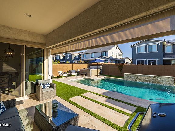Indulge in a low-maintenance backyard retreat featuring a brand-new, glistening pool with a spacious baja step, an elevated hot spring spa, artificial turf, and exquisite travertine that creates a pristine and captivating oasis. Your perfect living experience is on the horizon! Prepare to be captivated by this stunning turn-key dream home, meticulously cared for and boasting magnificent features. Revel in the expansive 10ft ceilings, a seamless indoor-outdoor flow facilitated by dual sliders, surround sound in the living room, a luminous entry, and upgraded berber carpet throughout. The gourmet kitchen is a culinary haven, showcasing quartz countertops, ample cabinet space, and a composite granite sink. (CLICK TO READ MORE) The owner's suite is bathed in natural light, offering dual vanities, and a luxurious bath area with a separate tub and shower, all adorned with ceiling-high tiling. Just like a world class resort this community offers a luxurious community pool, splash pads, numerous parks spread throughout, the Steadfast farm, the Handlebar Diner, and its very own state-of-the-art clubhouse "The Mark". The Mark hosts events throughout the year and a wide variety of family friendly games to play. This home promises a lifestyle of elegance and comfort. Don't miss the opportunity to explore this exceptional home!