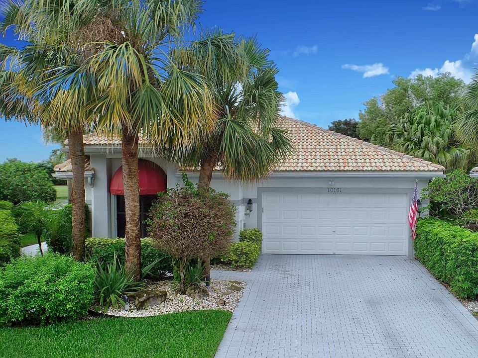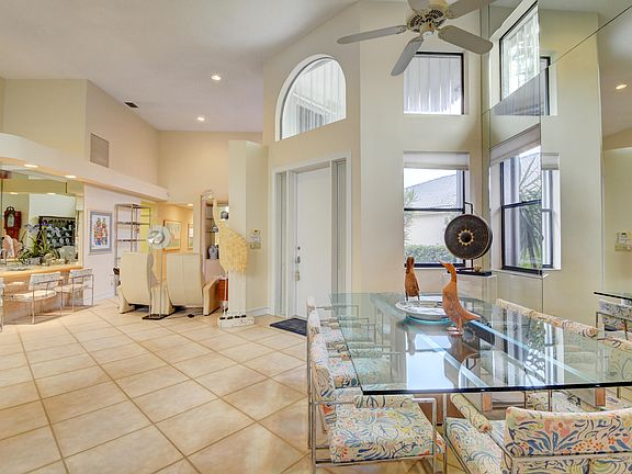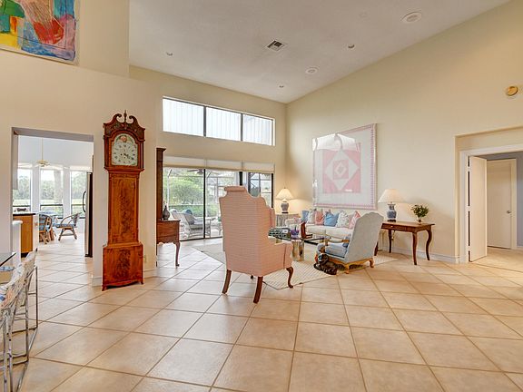 Great cul-de-sac lot with screened in swimming pool, direct LAKE & GOLF VIEWS and has fenced in side yard perfect for children and pets. Roof (4 years old), A/C has two units (4 years and 1 year old), Culligan water softener, Flo Logic system has been installed to determine and shut off water if a leak occurs (great for seasonal owners or if you travel often). This lovely home has 3 bedrooms, 3 full baths + powder room, living and family room, wet bar, volume ceilings, 2 car garage with storage cabinets and accordion shutters. Kitchen is sleek consisting of modern style teak wood cabinets, black granite countertop, black appliances and a large bay window in breakfast area that lets in lots of light. Neutral tile laid on the diagonal throughout home and guest bedrooms. (MORE)