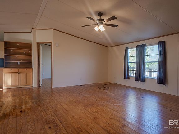 Here is your chance to live out in the country with NO HOA. This mobile home is situated on just under 1 acre of land. This 3 bed 2 bath home is perfect for anyone looking to be in South Alabama at an affordable price point. The first thing you will notice as you pull up is the large front porch which is 48 x 8. As you walk inside you will see the beautiful Pine Hardwood floors throughout. The large kitchen has custom cabinets, tile countertops, Samsung appliances including the stove, refrigerator, oven, and dishwasher. The master bathroom has new vanities with his/her sinks, a tub and separate shower. This home also comes with a washer and dryer. Out back is a 24 x 24 shop with 2 garage doors. Plenty of room to store your toys or have a nice workshop. The roof on the home and shop is 2 years old. The home AC was replaced 3 years ago. This home has had many upgrades including all new LED light fixtures and new paint throughout. Please come and schedule your showing today for this wonderful home in a quiet rural setting. Conveniently located in between Foley and Pensacola.