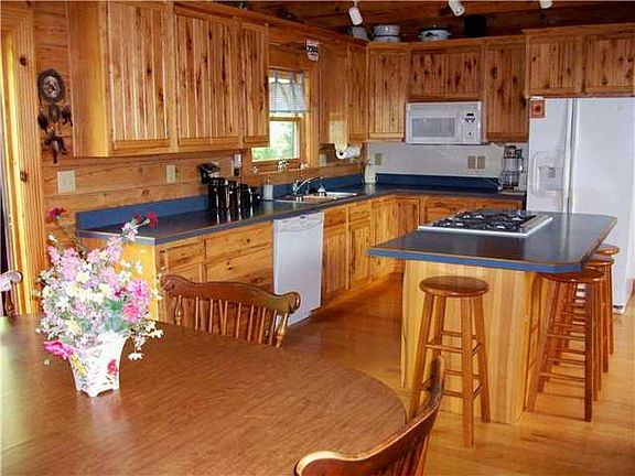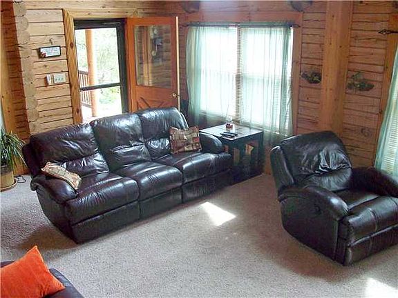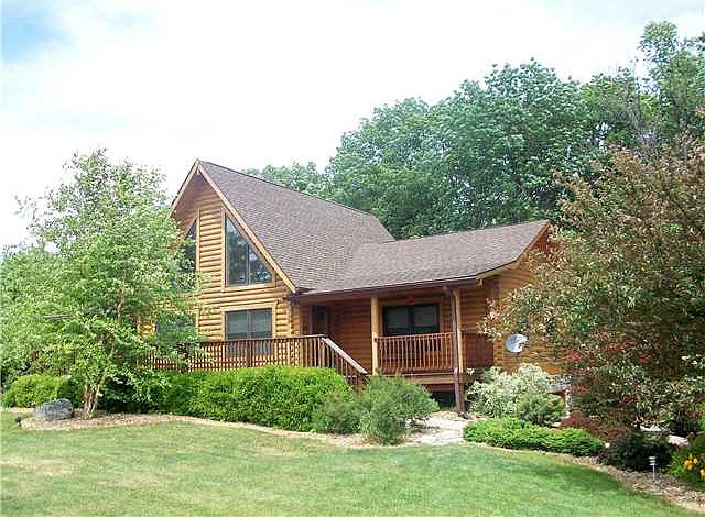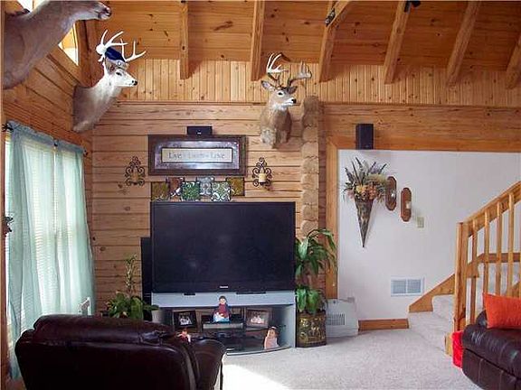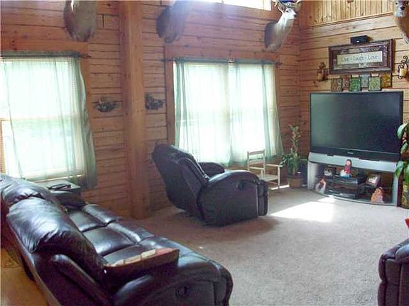 WOW! Gorgeous log home on 9.97 acres with it's own pond. Soaring ceiling with open beams in the 2 story great room, plus lots of windows! Beautiful kitchen & eating space, split bedroom floor plan with spacious master suite with a full bath with a garden tub & separate shower. Finished basement features a game room with a built-in bar plus a space for a TV or video games. The land offers plenty of room for the kids to play plus woods & a fully stocked pond. Come see paradise!