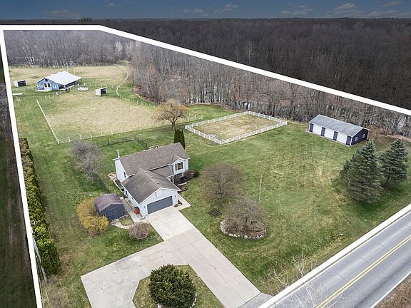 This sprawling estate offers over 25 acres with a blend of wooded and open spaces, presenting a haven for those who cherish privacy, nature, and equestrian pursuits. At the heart of this estate is a horse farm, featuring an impressive barn with a metal roof, an infrared-heated wash stall, seven horse stalls, a heated tackroom/office and a feed room. There's even a riding arena to hone your skills. The home itself is 3 beds and 2 full baths and has newer siding, doors, and windows. The main floor living area extends outdoors via a slider to the deck, where breathtaking sunsets are accompanied by serene sounds of nature. The walkout level has a fireplace and radiant heat flooring throughout. The 3rd bedroom can easily be converted to add a 4th legal bedroom. Additional amenities include a quaint greenhouse for gardening enthusiasts, and a 3-stall garage offering ample space for vehicles and outdoor equipment. Your technology needs are met with available Comcast internet, ensuring connectivity for working at home. This exceptional property boasts not only prime hunting land but also the potential for future development with options to split the lot (more details can be provided by Oakfield Twp). Discover a life of unspoiled beauty in Rockford, Michigan where every day feels like a getaway.