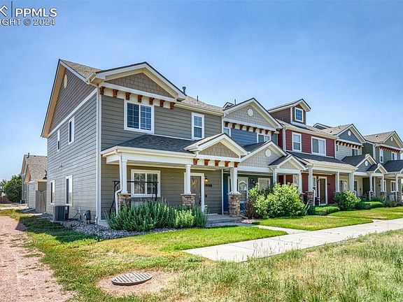 Great location, end unit next to open space with views of Pikes Peak. 3 bedrooms, 2 1/2 baths, oversized 2 car garage end unit townhome. Walk into the main level having a large kitchen with newer appliances, big single farm sink with garbage disposal, lots of counter space and cabinets, large island, pantry, dining area, spacious living room with patio slider to backyard, half bath, and under stair's storage. Walk up the stairs to the top floor with the primary suite and ensuite bathroom with double vanity, big garden tub, shower, and walk-in closet on one end of the hall and the two other bedrooms and full bath on the other end. Bedrooms are good size and one of the extra bedrooms has a walk-in closet. All bedrooms have ceiling fans. The laundry space is conveniently located at the top of the stairs for easy access with newer washer and dryer. Home comes with a water softener and air purifier. This is the best lot in the community, with open space adjacent to it and amazing views of the mountains. Playground is right down the road and neighborhood walking trails are practically right outside the front door. Close to schools and military bases. New water heater 2023, AC installed 2017, and Nest Thermostat. Exterior maintenance free living with HOA taking care of snow removal and yard work. Don't let this opportunity pass you by to make this house your home or make it into a great investment property. Schedule your showing today.