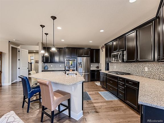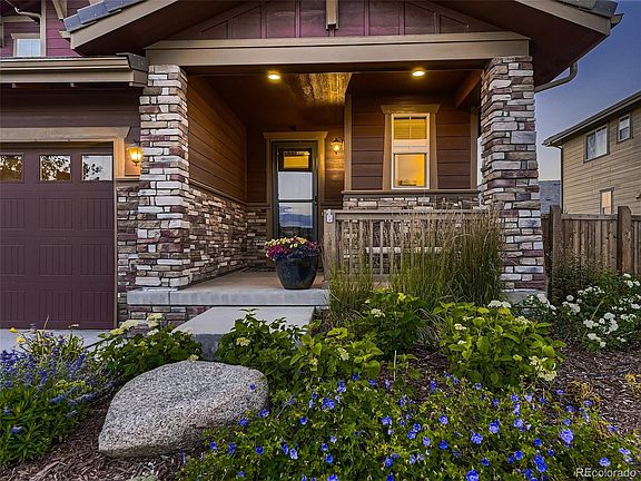Immaculate condition! Barely lived in, move in ready and has all of the little extras. Spacious front porch, beautiful kitchen with 5 burner gas cooktop, double ovens, stunning backsplash, grand island, large walk in pantry and soft close cabinets. Open concept main floor with kitchen, living room, with cozy gas fireplace, breakfast nook and formal dining room. Back door leads you to an outdoor oasis with a covered deck, planter boxes, all on a drip line, outdoor TV, privacy screen and backs to green space and walking path. Upstairs the Master retreat boasts a large soaking tub, linen closet, walk in closet with full organization, 2 additional bedrooms, full bathroom with double sinks, laundry room with added cabinets and shelving and a Loft or bonus room ~ perfect for home office! Walk out basement finished with large bonus room, wet bar and wine cooler. Pool table and all equipment stay with the home. Additional bedroom, full bathroom and storage on this level. Back door leads you to decorative concrete patio with hot tub and thoughtful landscaping for privacy. 2 car garage ~ that is truly oversized, finished, epoxy coating floors, storage cabinets and ceiling storage. A Toyota Tundra truck will fit in this garage! Custom Hunter Douglas blinds throughout the home, some with up/down feature, 5" baseboards and dimmers on appropriate lights. Trash can containment on side of home, outdoor TV is encased to avoid weather exposure and security, cabinets added to entry off of garage and to the laundry room, newer front security door, ceiling fan in master bedroom and exterior paint trim. Meridian Village offers trails, parks and a pool. Easy access to Denver, Castle Rock and DIA.