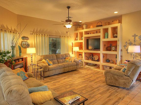 Immaculate Santa fe style home on a golf cours lot. Features bright and open kitchen with granite tile counter tops. Newer upgraded tile and freshly painted throughout. 3rd bedroom is used currently as an office/2nd den with a bay window. Master bedroom features high ceilings and 2 separate walk-in closets. Enjoy the sunsets on the pool deck looking over the Mesa Del Sol golf course. Low maintenance heated pool with waterfall. Big and bright family room with fantastic views to the backyard and pool.